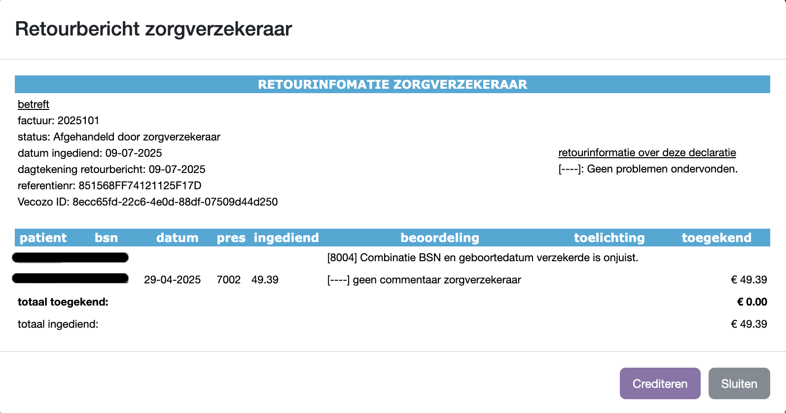 Hieronder wordt het proces van crediteren bij een complete afkeuring van de verzekering beschreven. Daaropvolgend wordt er beschreven hoe de creditfactuur wordt verwerkt en hoe de behandeling weer opnieuw ingediend kan worden als dit gewenst is.