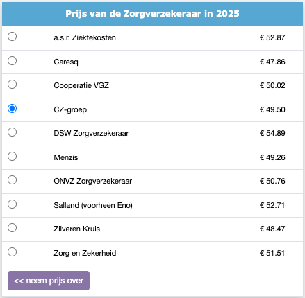 3. Het formulier vult zich weer met de ingevoerde gegevens. Aan de rechterkant hiervan komt er een lijst met overkoepelende verzekeringen en de vergoeding. Selecteer de correcte overkoepelende organisatie voor de behandeling en klik op '<< neem prijs over'.