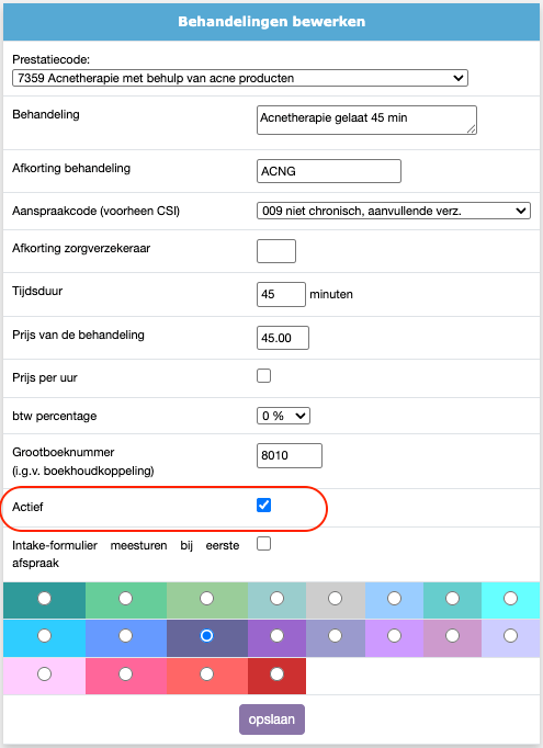 | Intake-formulier | Indien er gewerkt wordt met intake-formulieren kan er met dit vinkje aangegeven worden bij welke behandelingen deze verstuurd moeten gaan worden. Meer informatie hierover kun je lezen bij 'Intake formulier instellen'. |