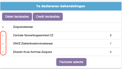5. Klik op het plusje voor de verzekering. Maak de conceptfactuur aan door op de naam van de cliënt te klikken. Gaat het over het crediteren van een bulkfactuur dan kun je alle cliënten tegelijk op één creditfactuur zetten. Hiervoor selecteer je het vakje voor de cliënten en klik je op ‘factureer selectie’.