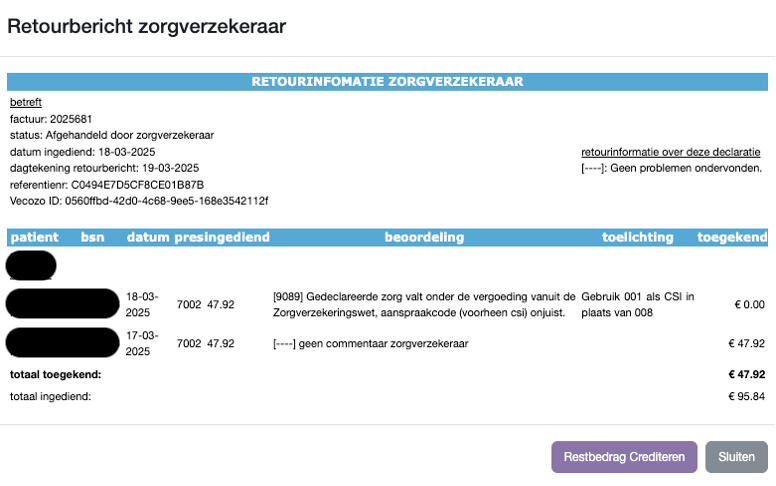 Hieronder wordt het proces van crediteren bij een deel-afkeuring van de verzekering beschreven. Daaropvolgend wordt er beschreven hoe de creditfactuur kan worden verwerkt en hoe de behandeling weer opnieuw ingediend kan worden mocht dit gewenst zijn.