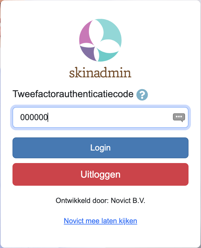 - Neem de 6-cijferige code van de authenticator over op het extra inlogscherm in Skinadmin en klik op ‘Login’.