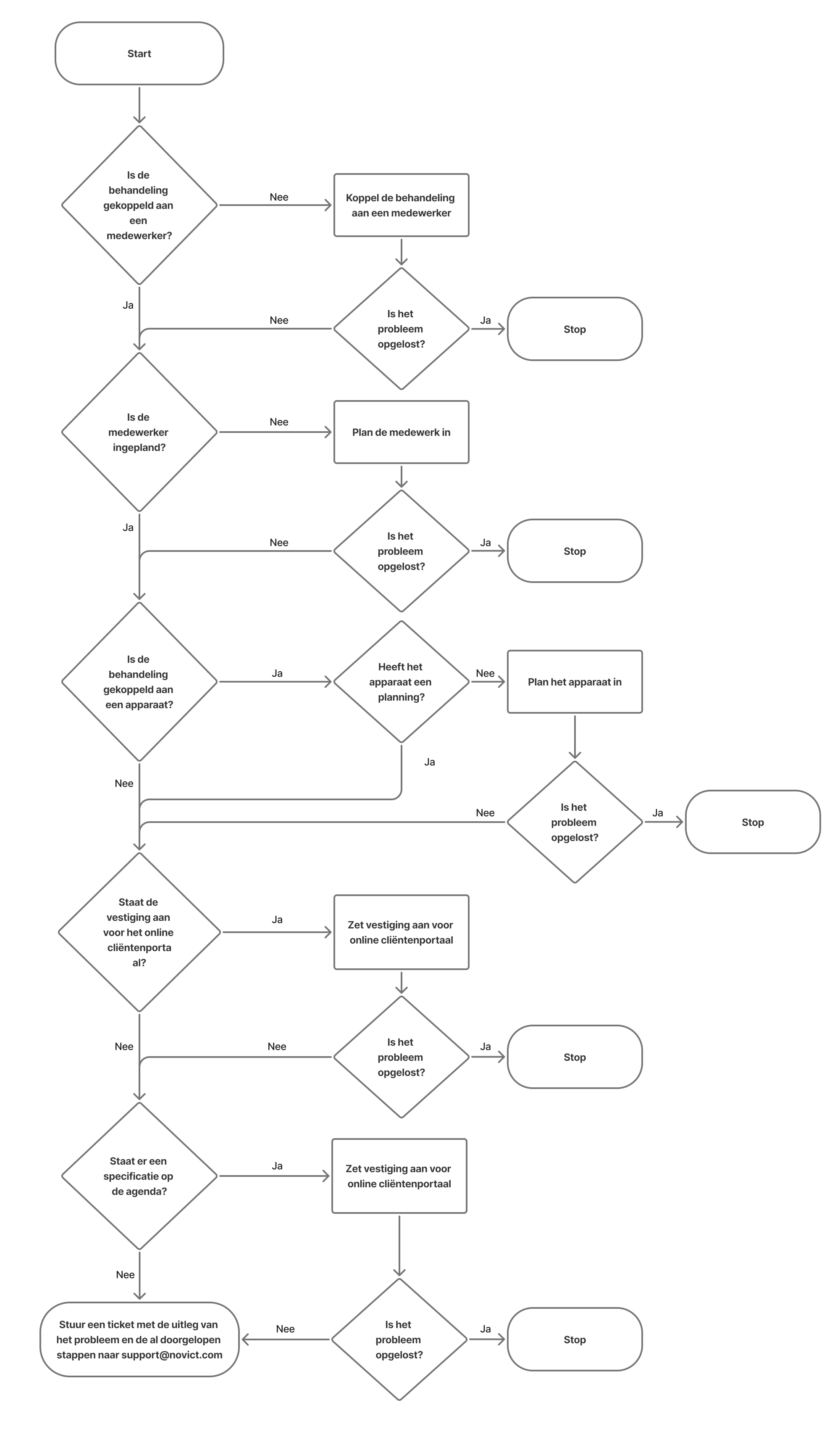 Op het moment dat het online cliëntenportaal de melding geeft dat er geen vestiging beschikbaar is, ligt dit er meestal aan dat de basis van het systeem, de planagenda, niet goed is ingevuld. Het onderstaande stroomschema kan gevolgd worden voor het nalopen van alle instellingen.