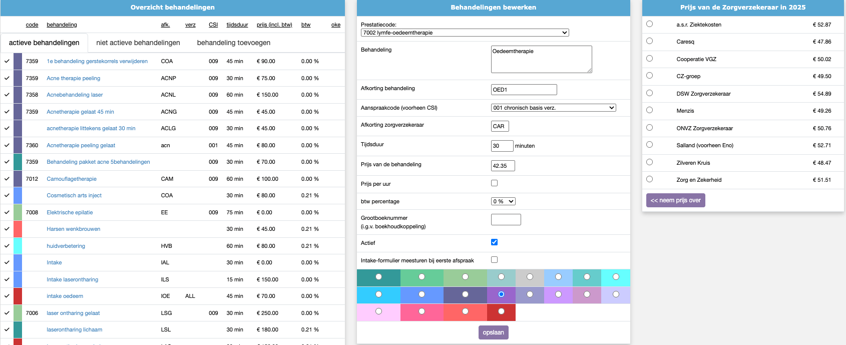 2. je ziet dan naast het scherm waarop je de behandeling kunt bewerken, de nieuwe prijzen staan van de zorgverekeraars. Kies de bewuste zorgverzekeraar met prijs aan en [<< neem prijs over].
